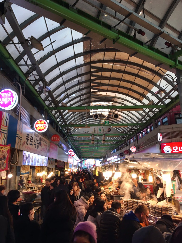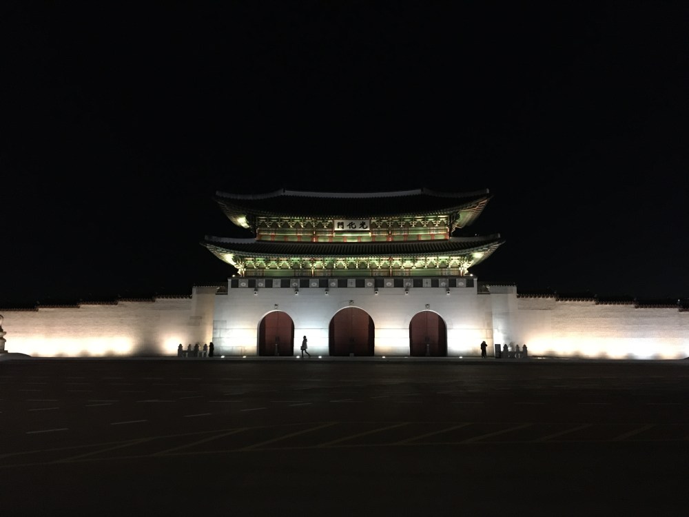 The next hours of travel where more relaxed and after struggling to find the right meeting point I was very happy to finally see Sara again. Even though I absolutely enjoy being in Japan, it is great to have an old friend to spend time with in this totally different setting and culture. We spent the evening wandering through the fascinating and colourful street food markets of Hoehyeon-dong where everything was lighted by neon lights. Later on, we walked a bit further to the “Gyeongbokgung” palace. After sunset the temperatures dropped immediately below zero, but the lively atmosphere in the streets didn’t change at all, which was a cool thing to see.
