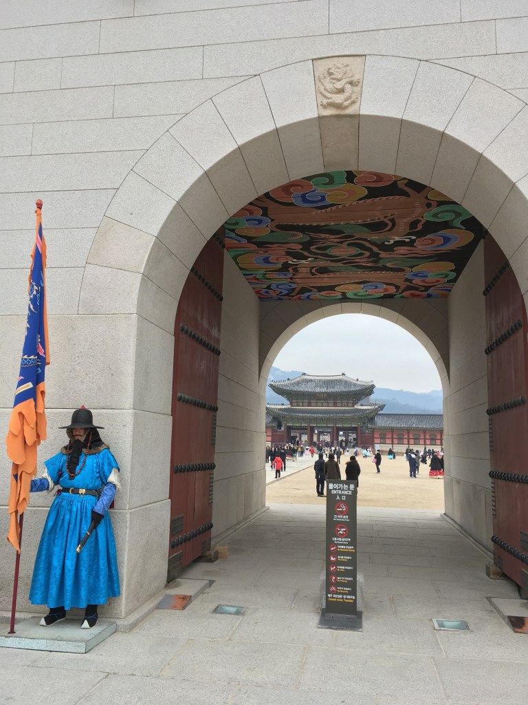 Ich werde Seoul als eine kribbelbunte und lebendige Stadt in Erinnerung behalten. Nach einem fantastischen Sonnenuntergang erstrahlten die Straßen des Hoehyeon-dong Viertels unter hunderten von Leuchtschildern. Gleichzeitig mit dem Verschwinden der wärmenden Sonnenstrahlen fielen die Temperaturen rapide auf unter Null herab. Das hielt die Leute in den Straßenmarktständen jedoch nicht davon ab, ihr Essen anzubieten, was ganz eindeutig auch den Charakter von Seoul ausmacht. Das Leben findet hier auf den Straßen statt und das eben auch im Winter. Mit neuer Energie dank des leckeren Bibimbap und Kimchis, zeigte mir Sara noch den großen Palast „Gyeongbokgung“.